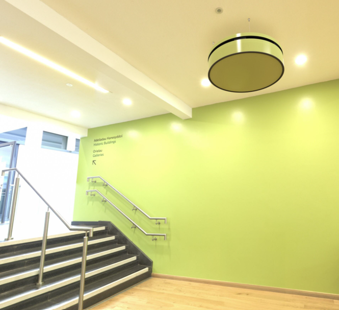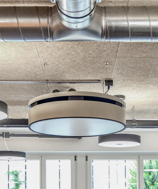Der KaDius kann als Unterdeckengerät knapp unter der Decke montiert werden, aber auch frei hängend im Raum integriert werden. Seine Außenhülle kann einfach individualisiert werden.