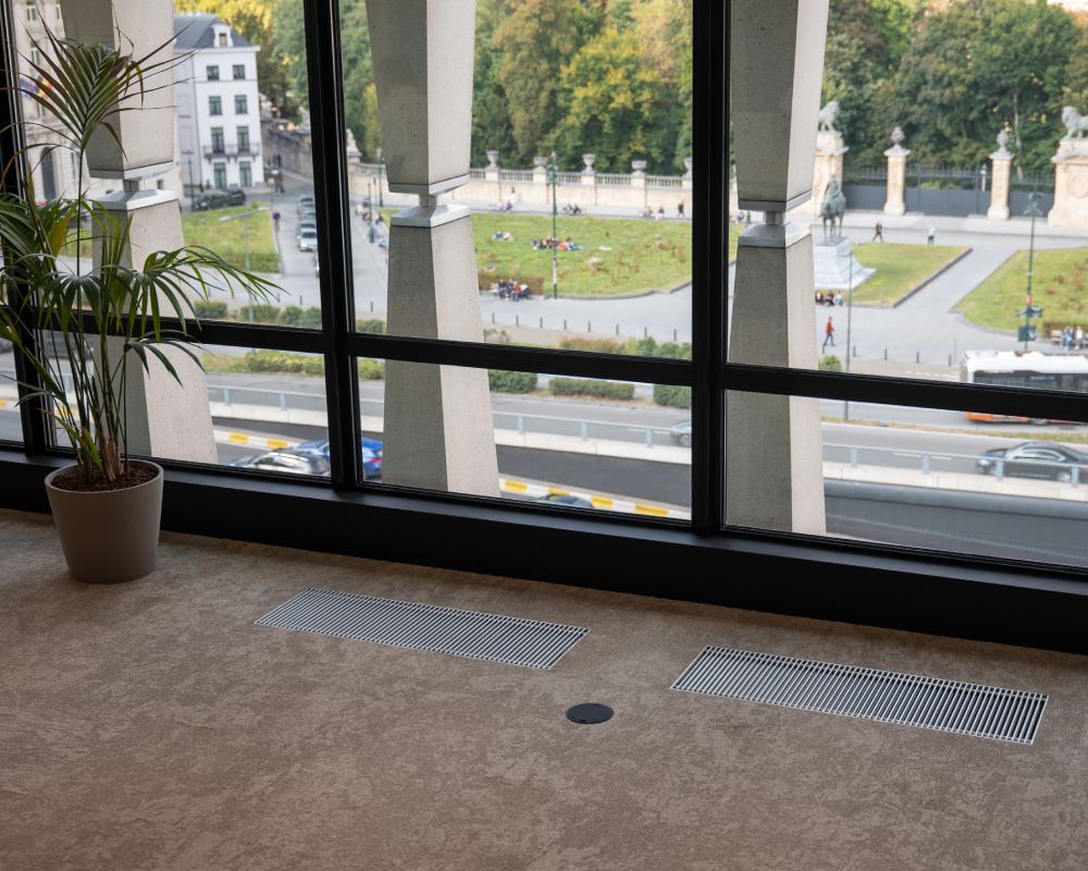 Auch Kampmann leistet einen wesentlichen Beitrag zum nachhaltigen Gesamtkonzept des Gebäudes. Im Marnix-Gebäude wurden insgesamt über 1.800 Unterflurkonvektoren des Typs Katherm HK installiert, was einer Gesamtlänge von fast zwei Kilometern entspricht. Zum Einsatz kamen Geräte in der Baugröße 340 × 165 mm in 4-Leiter-Ausführung mit Aluminium-Rollrost in Naturausführung, ausgelegt für den Anschluss von Frischluft. Je nach Anforderung wurden die Einheiten entweder mit einem oder zwei Primärluftstutzen ausgestattet.